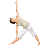 Расставьте стопы пошире и разверните их вправо. Вытяните руки в стороны. Опустите правую руку на лодыжку, а левую вытяните вверх. Поверните голову и посмотрите на большой палец левой руки. Сделайте пять циклов дыхания. Выйдите из позы, затем выполните позу влево.