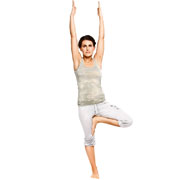 Встаньте в Тадасану. Прижмите правую стопу к полу, затем, согнув левую ногу в колене, приблизьте левую стопу к правому паху. Вытяните руки в Урдхва Хастасану. Балансируя на одной ноге, активно прижимайте правую стопу к полу, а левую к внутреннему бедру правой. Смотрите поверх кончика носа. Сделайте пять циклов дыхания. Вернитесь в Тадасану. Выполните позу Дерева влево.
